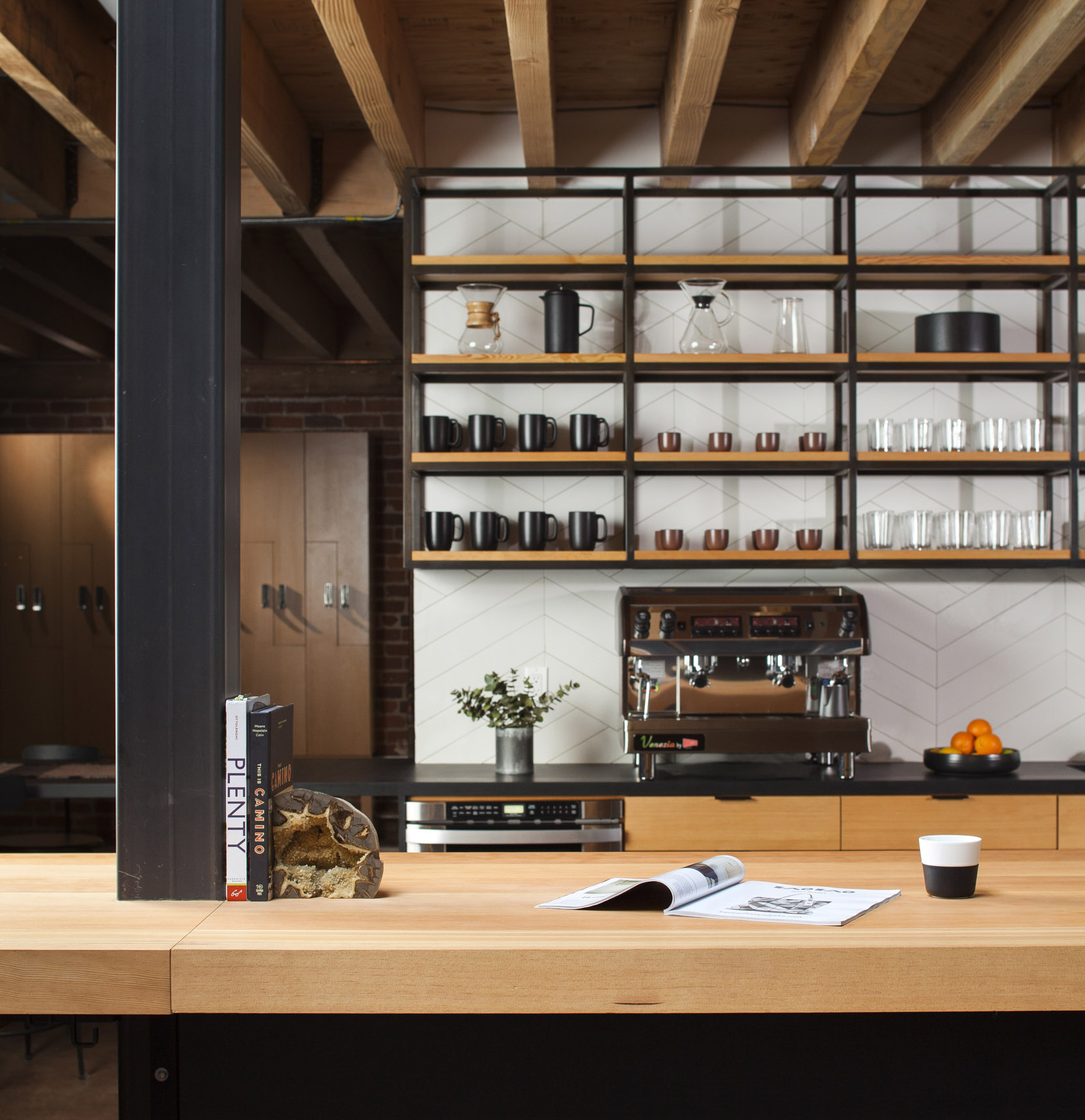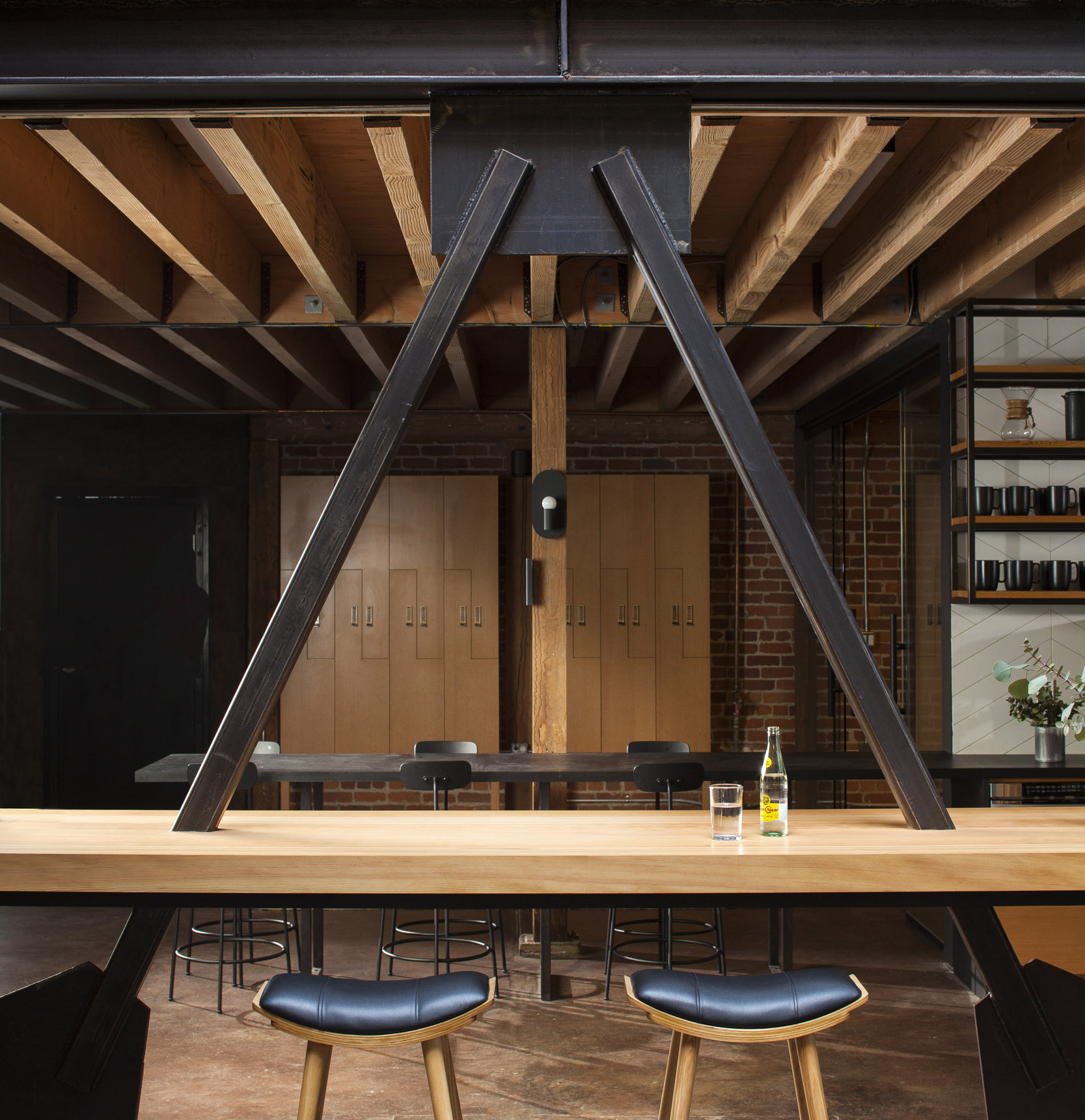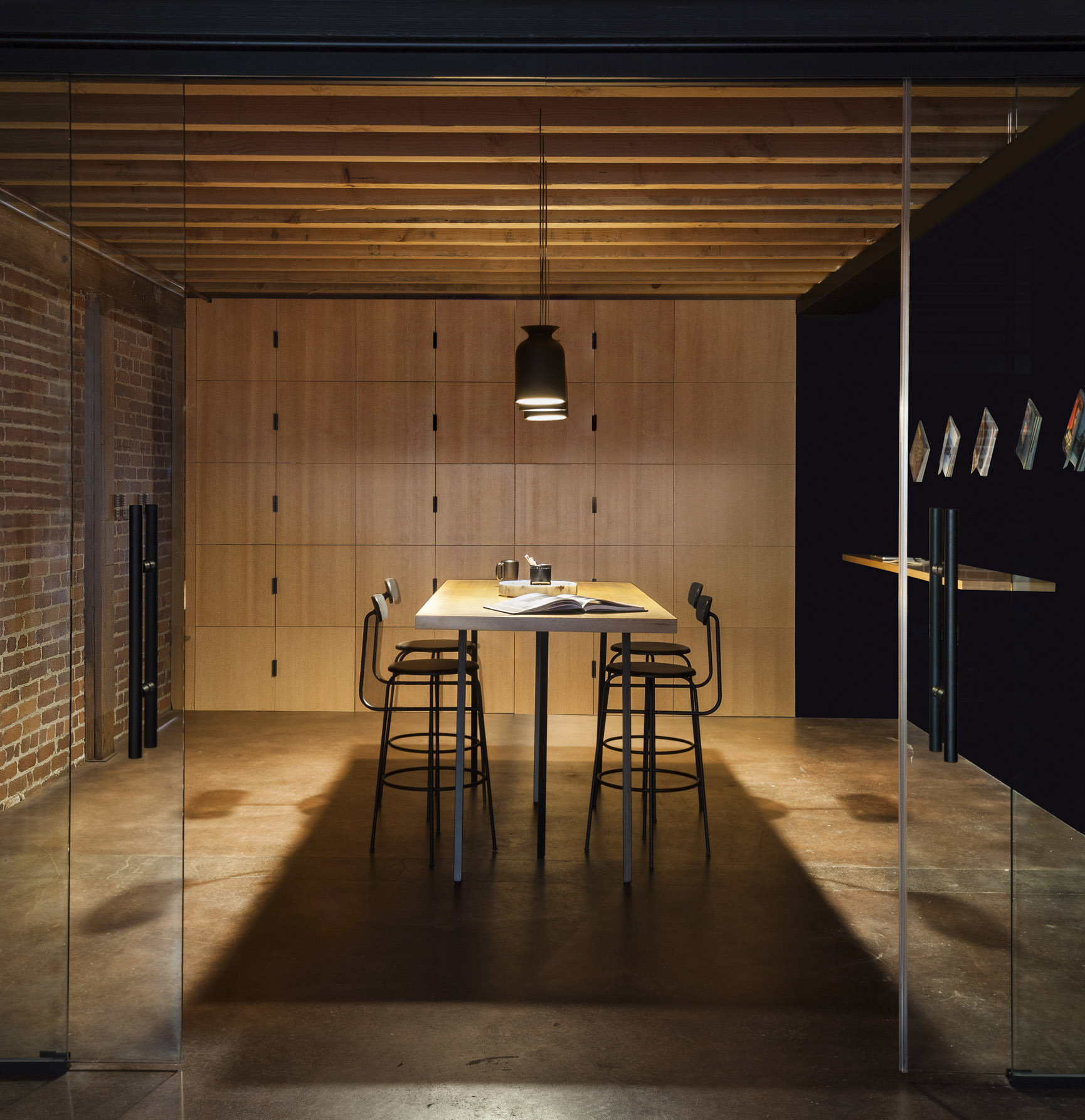 mentor new leaders and where industry friends could gather for events or just a coffee. Spatially a large glass entry courtyard leads to a plant filled indoor courtyard. A custom designed kitchen space animates the core with people congregating at the central island and café stools.