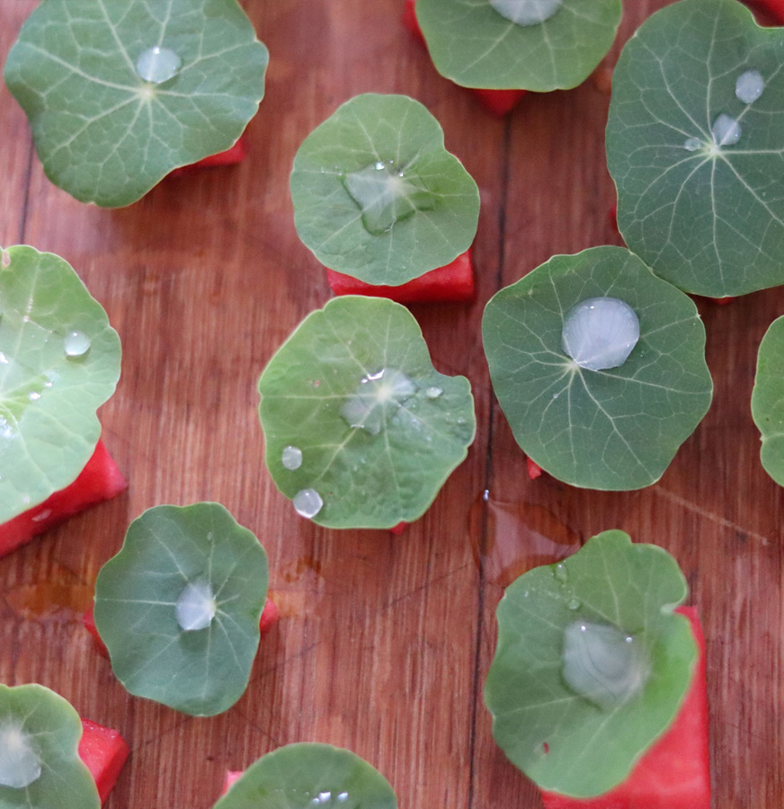 Make a Summer Refresher – watermelon cube, Nasturtium leaf, and lime rain drops