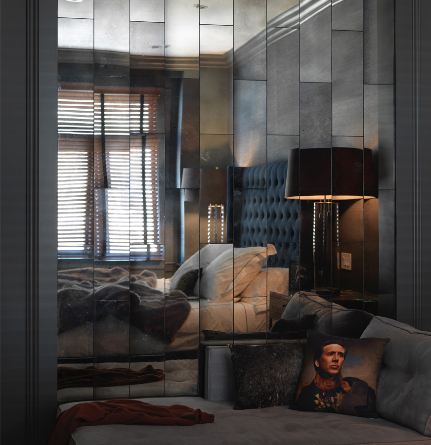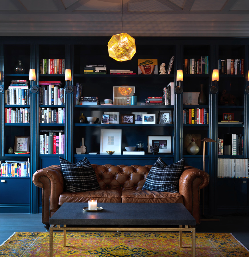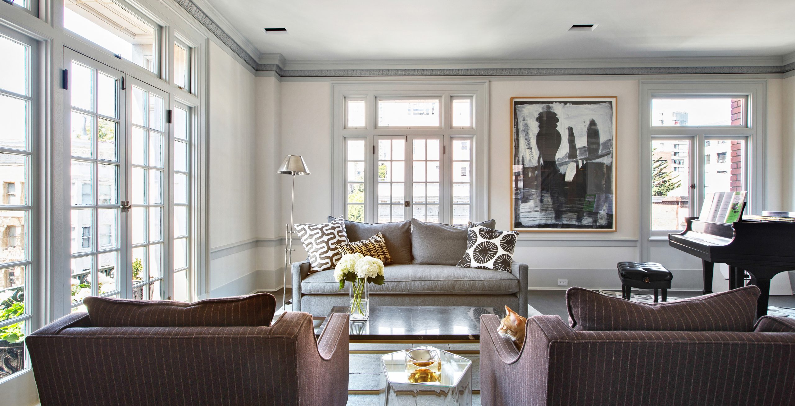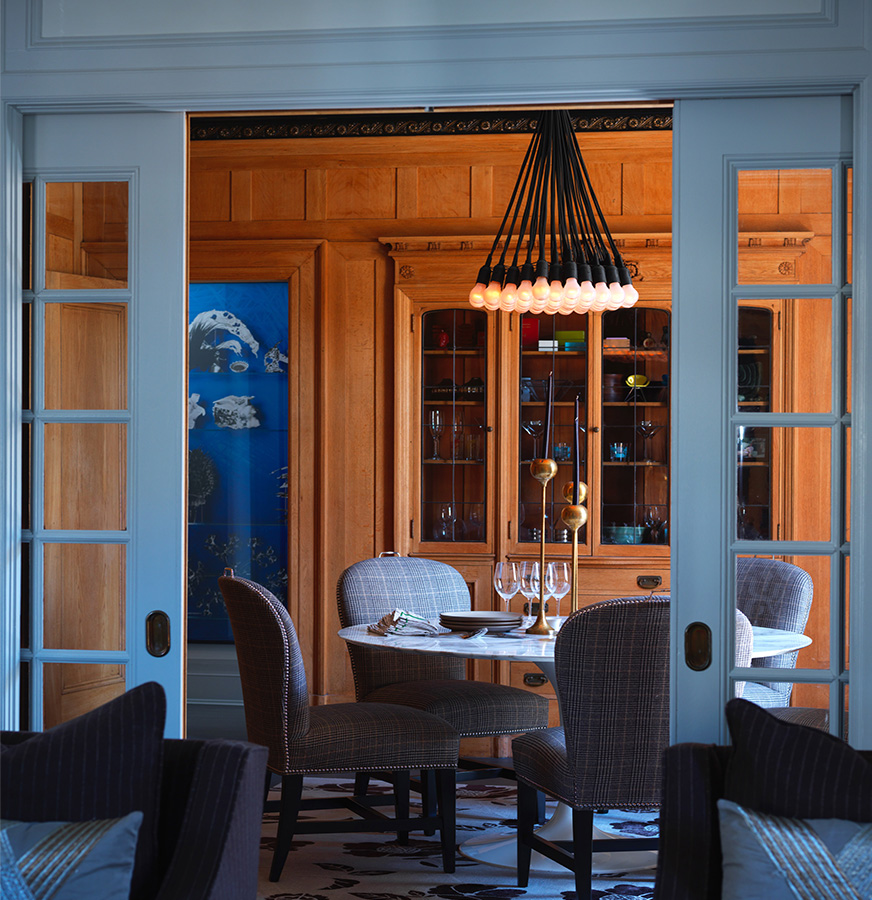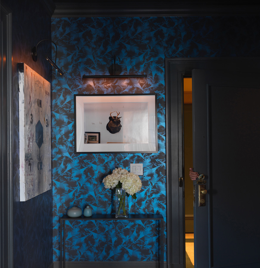 Perched above downtown San Francisco this Beaux-arts aerie had a storied history in need of a refresh. Our approach was to honor the past with a mixture of irreverence and restraint. Original layout was modestly tweaked, molding trim and finishes were refurbished. At the same time wallpaper was added at strategic locations including on the ceiling, a blue lacquered built-in created a study and bar and a wall of silvered mirror made the home uniquely suited to our clients.