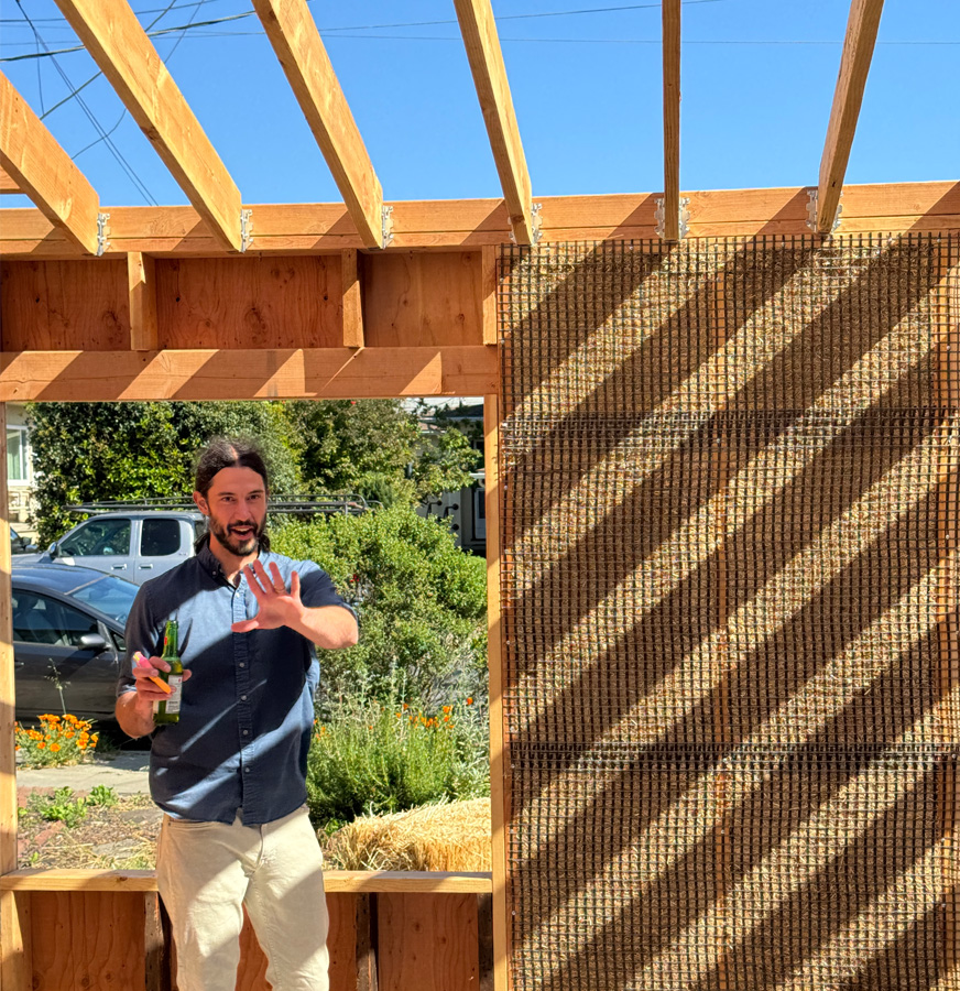Anthony Dente from Verdant Engineers is known for his expertise in natural building techniques. Traditional straw bales walls are 18-24” thick, which limits their application in high density settings. He formed a company called Verdant Panels to engineer a structurally insulated panel (SIPS) filled with straw, a carbon sink. Typical SIPS panels have high embodied carbon and are filled with EPS or XPS Foam made from petrochemicals. SIPS Panels are a familiar building technique for many contractors and at 6-8” thick the Verdant Panel can be used as component on a much wider range of projects than traditional straw bale. We are using it at an ADU in Nicasio.